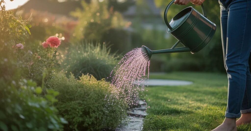 Step 5: In a sustainable garden for beginners, water plants regularly in the morning.